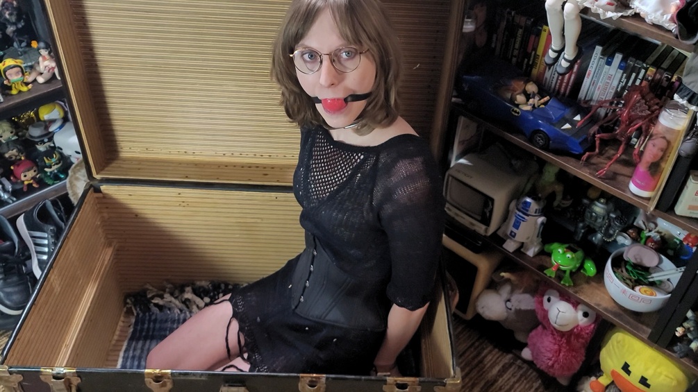 I really got myself into a tight spot this time! First, I'm tightly ballgagged locked into a hogtie with a heavy neck cuff, and handcuffs on my wrists and ankles, left to roll around on the floor. Then I'm sat up inside an old trunk, drooling all over myself, before my owner decides to lock me in for the night, leaving me with nothing to do but struggle in the dark.